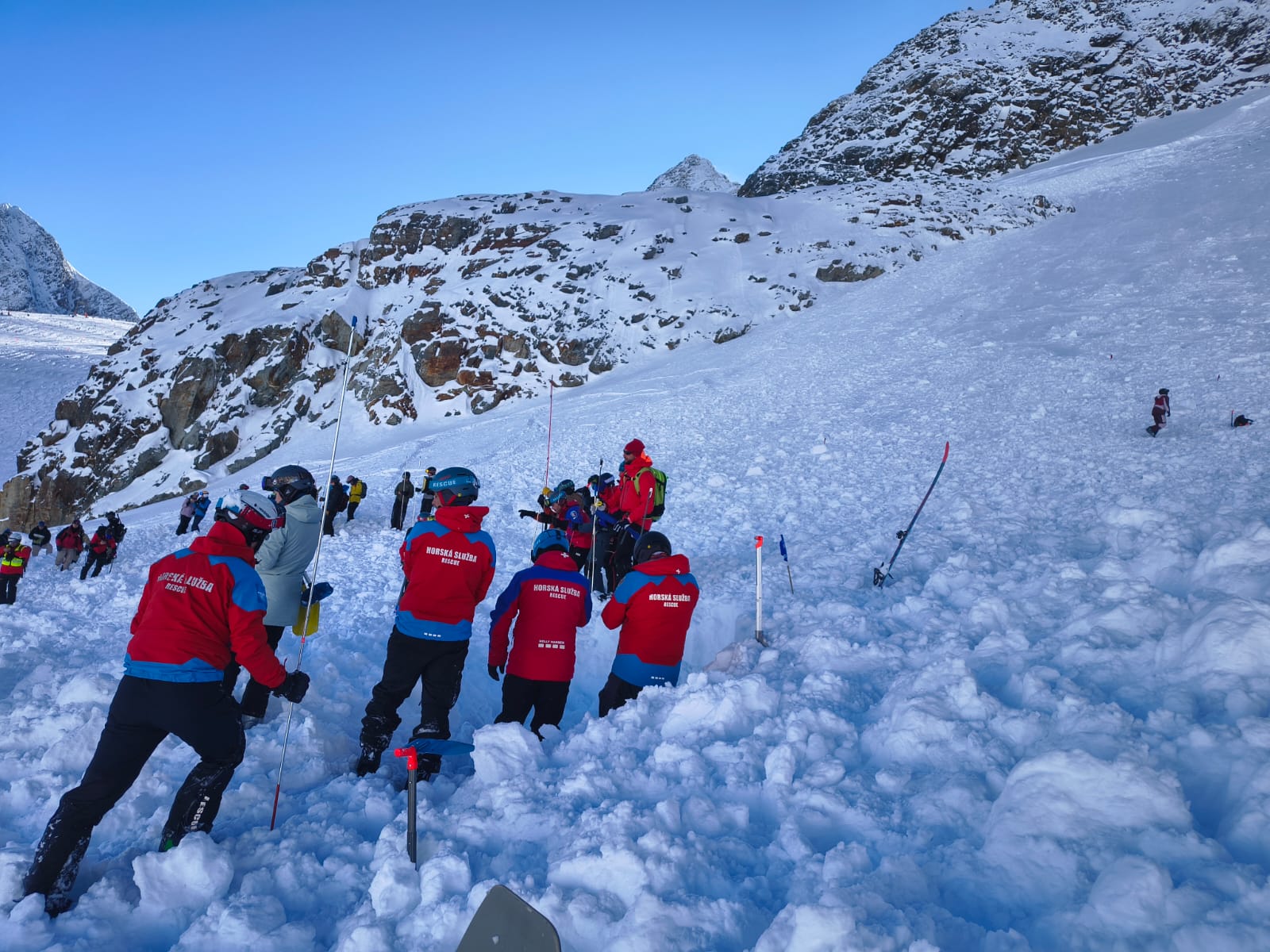 Do akce se dostalo veškeré naše vybavení pro pátrání po obětech lavin. Využili jsme nejenom lavinové vyhledávače, sondy a lopaty, ale také jsme použili vyhledávací systém RECCO, který byl vyvinut právě pro takovéto nehody. Lavina velkého rozsahu, která je v lyžařském středisku, se propátrává velice pečlivě, protože počet zasažených není v prvních chvílích zcela zřejmý.“ Popsal situaci na místě vedoucí prvního běhu kurzu J. Pochobradský, metodik HSČR.