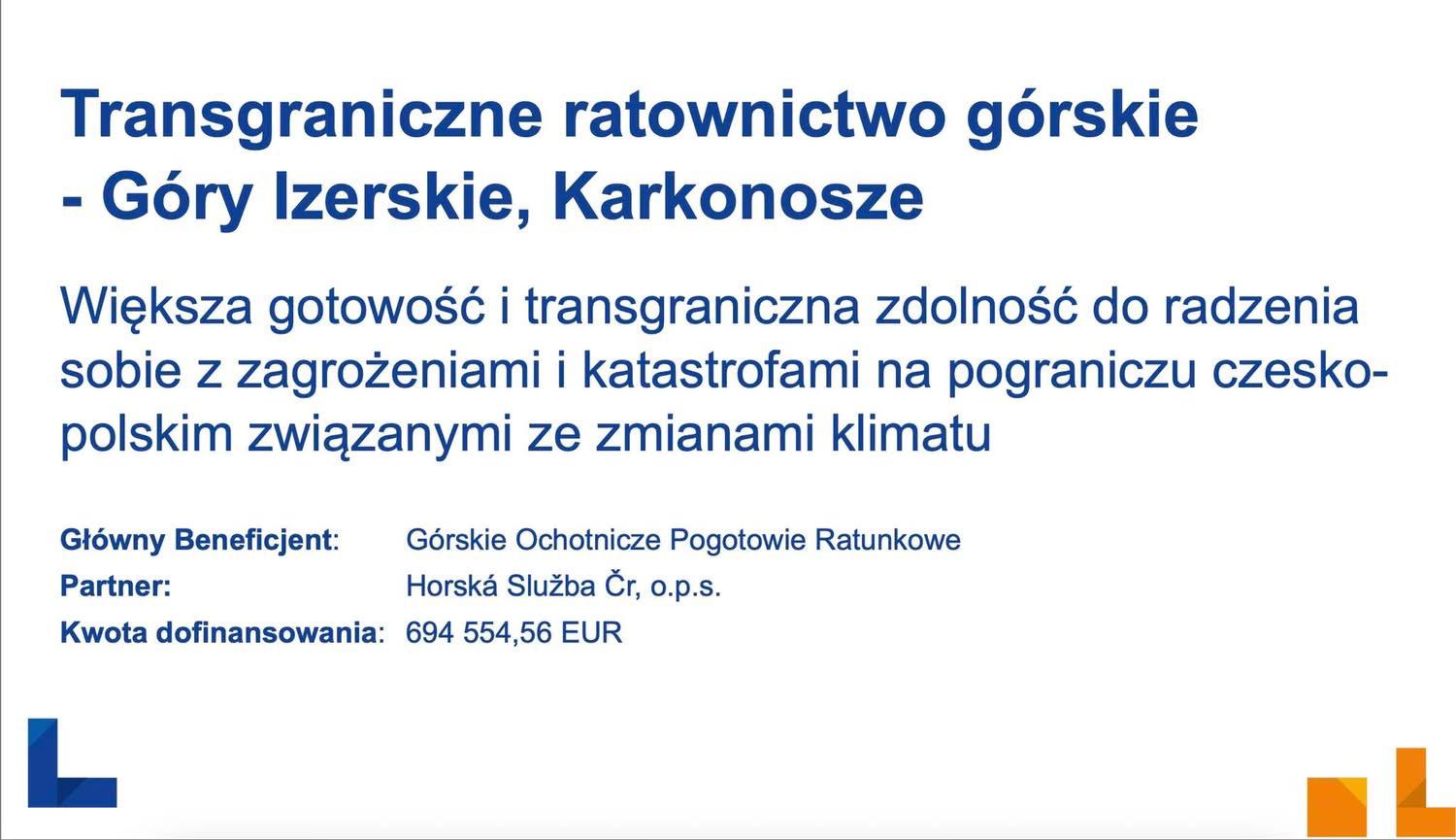 Projekt „Přeshraniční horská záchrana – Jizerské hory, Krkonoše” (č. CZ.11.01.01/00/ 24_012/0000179) je spolufinancován z Evropského fondu pro regionální rozvoj v rámci programu Interreg Česko-Polsko 2021-2027, Priorita 1.1 – Vyšší připravenost a přeshraniční schopnost zvládat hrozby a katastrofy.