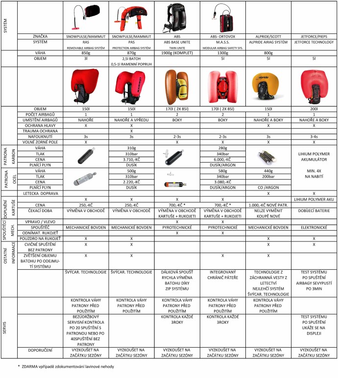 Jednotlivé systémy lavinových batohů a jejich výrobci