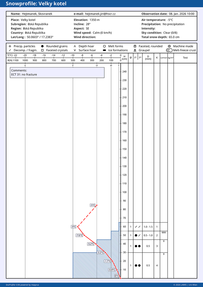 | Sníh: | Celkem: 15 cm, Nový: 5 cm, Kvalita: nový sníh - suchý |