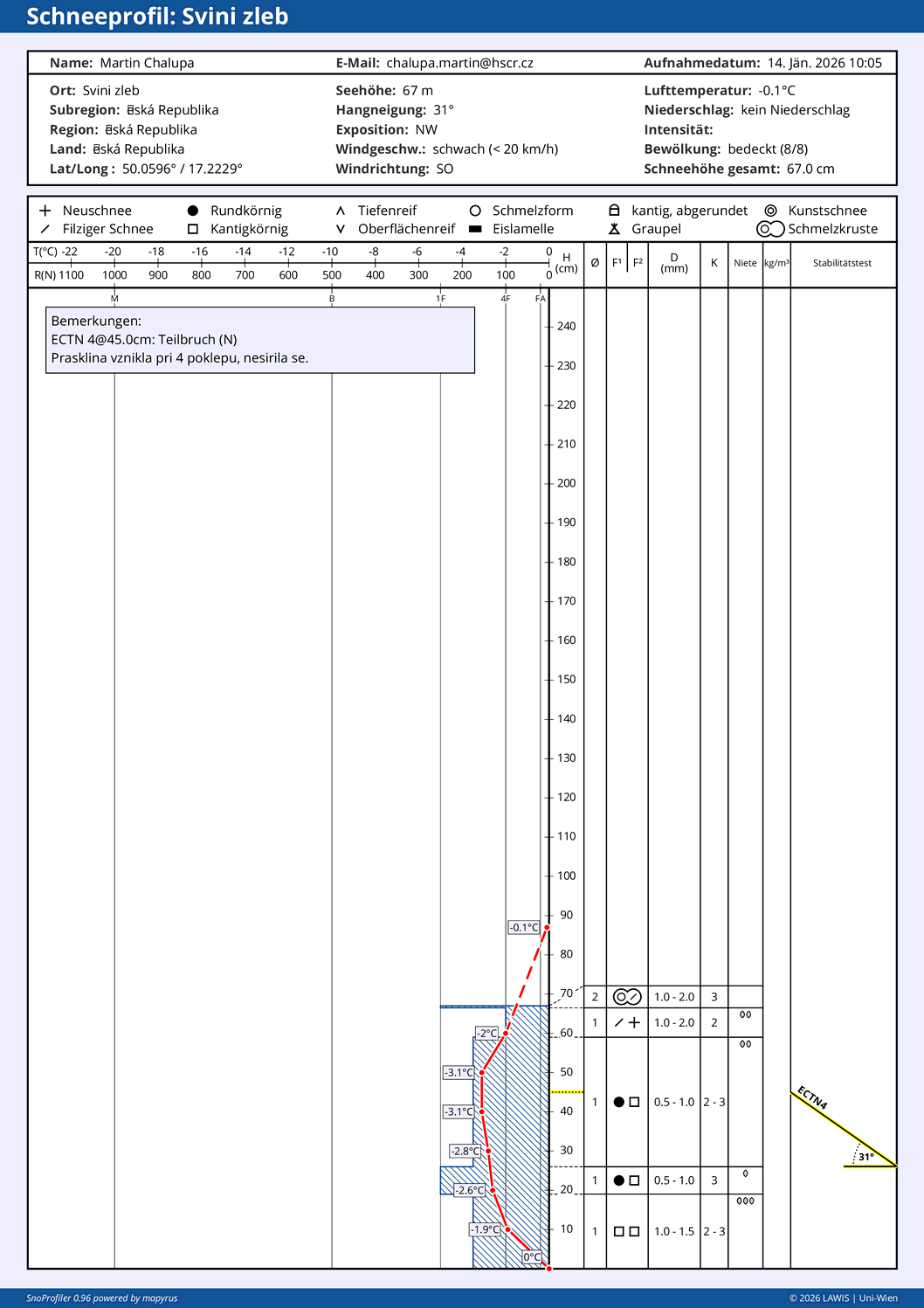 Další kritické místo je cca 30 cm pod povrchem sněhové pokrývky. Uvolnění laviny může nastat po větším dodatečném zatížení.