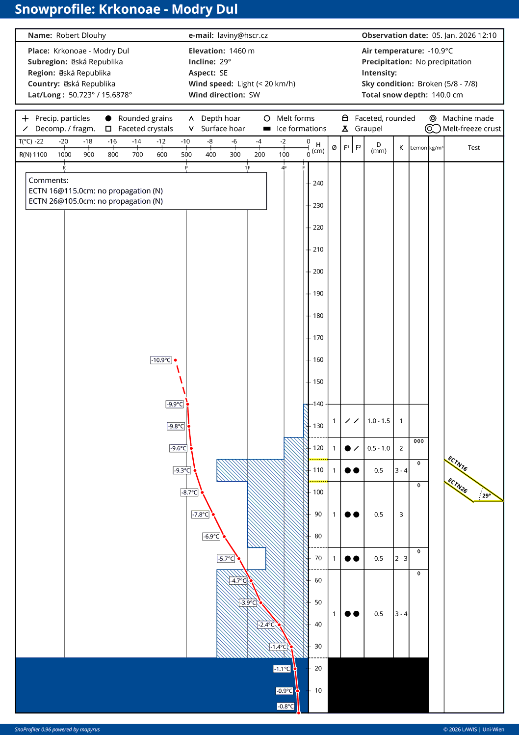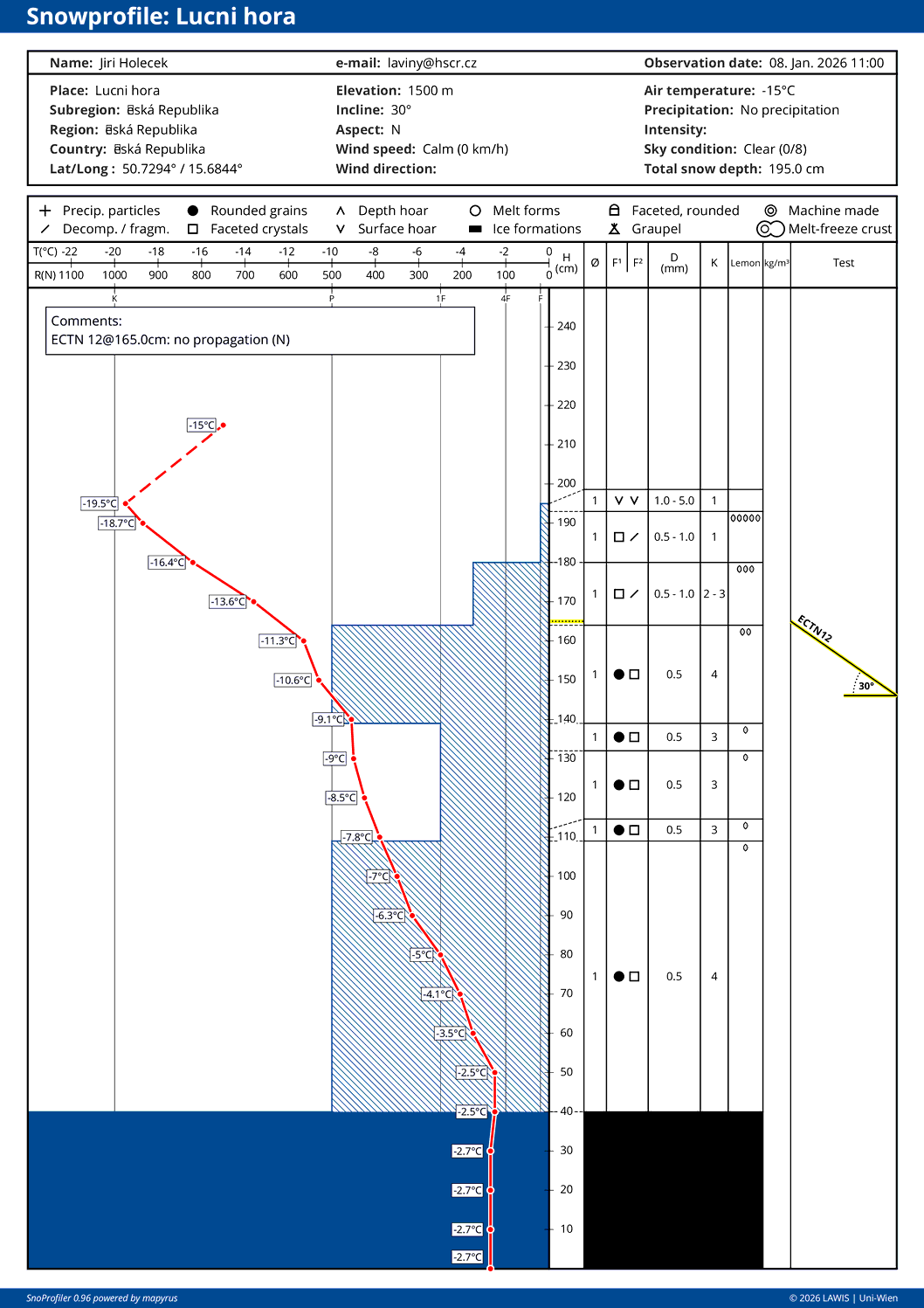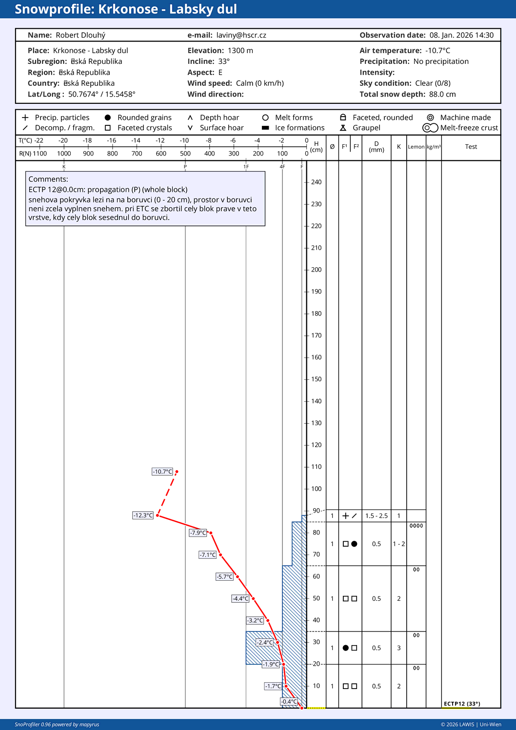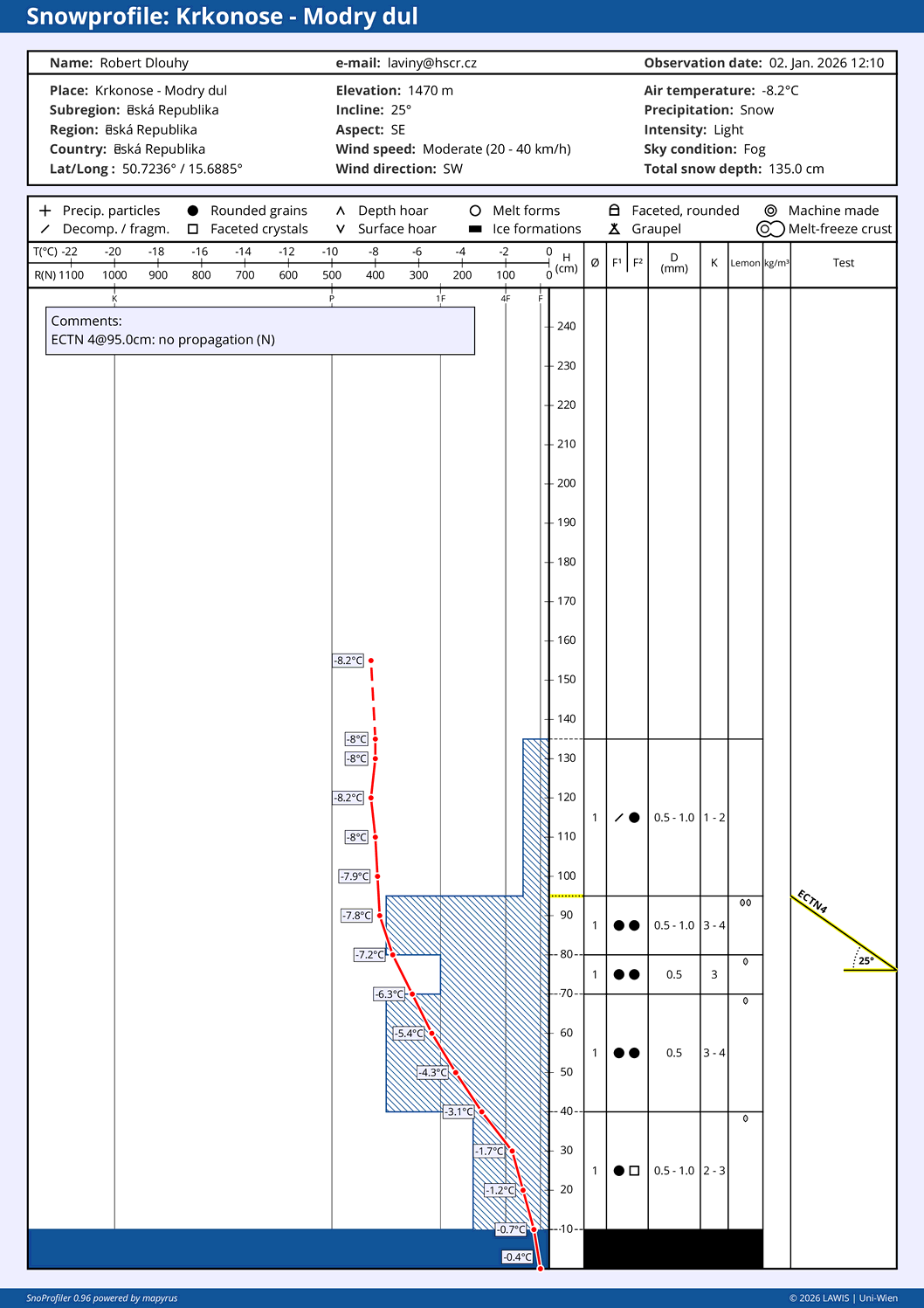 | Srážky: | Sníh: 0,1 až 0,5 cm/h |