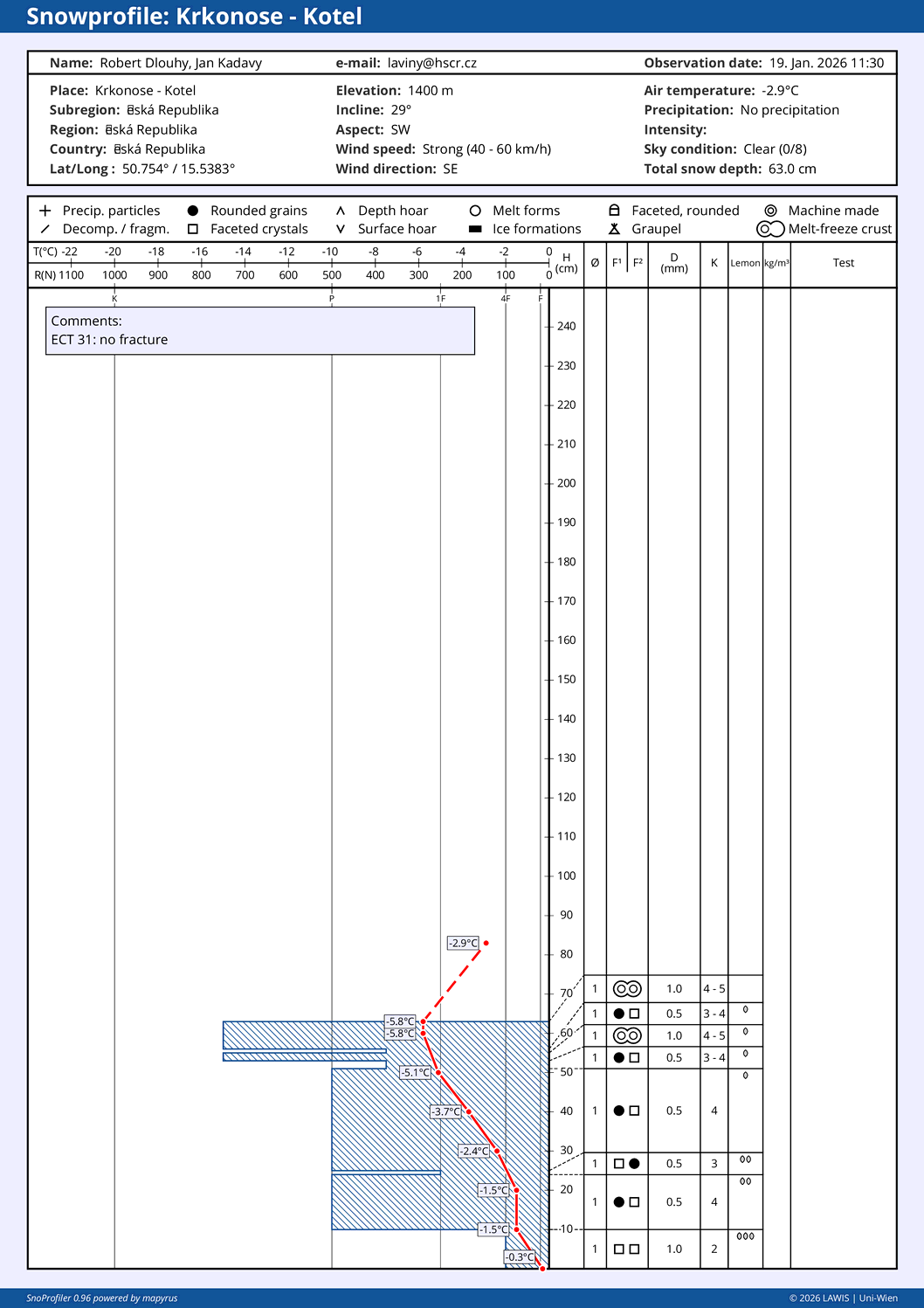 | Snow: | Celkem: 99 cm, Nový: 5 cm, Kvalita: nový sníh - vlhký |