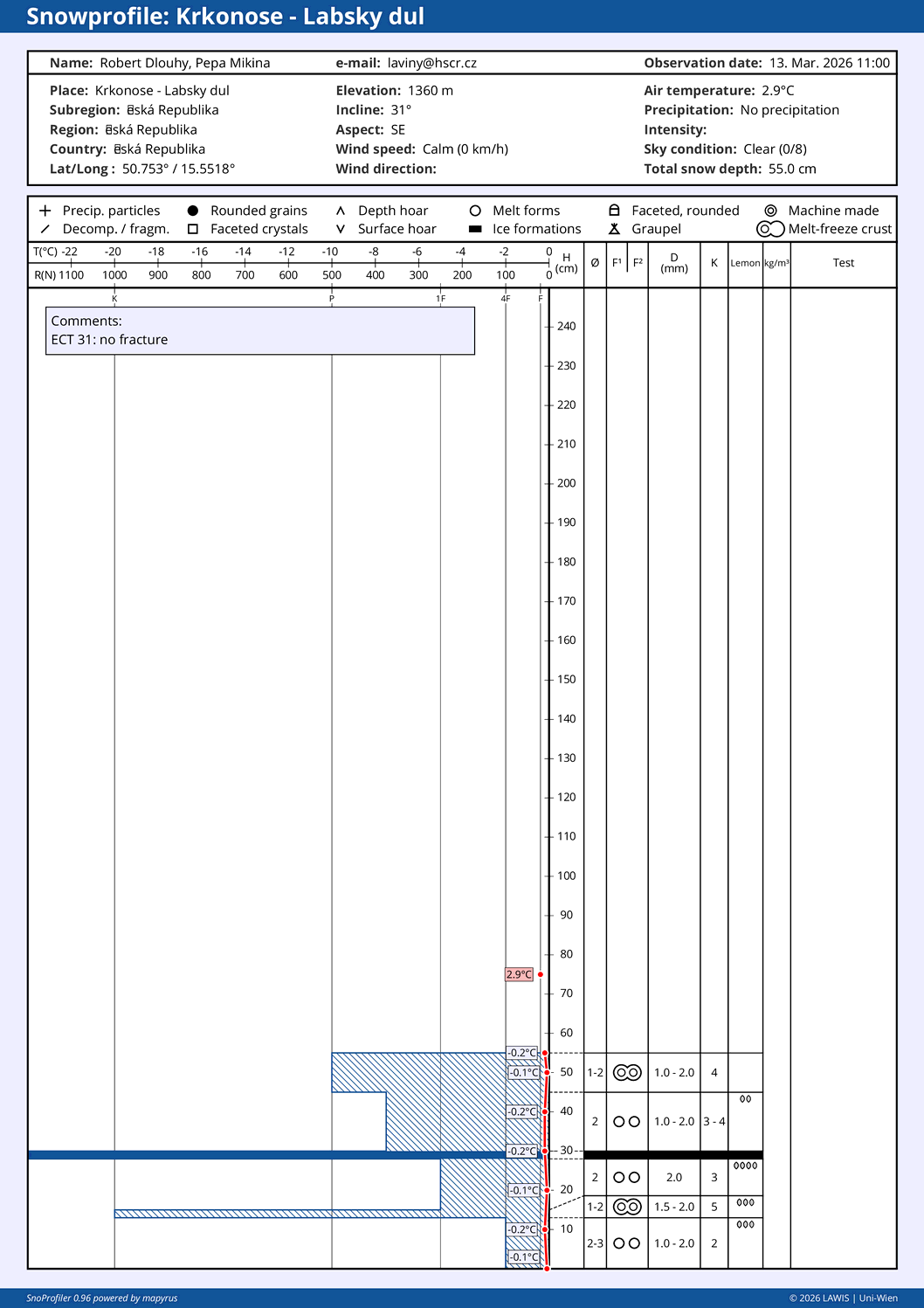 | Sníh: | Celkem: 50 cm, Nový: 0 cm, Kvalita: starý sníh - zmrzlý |